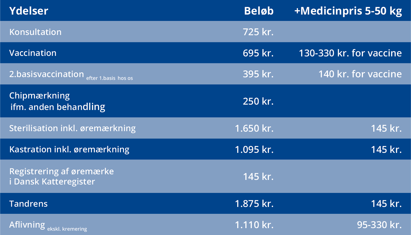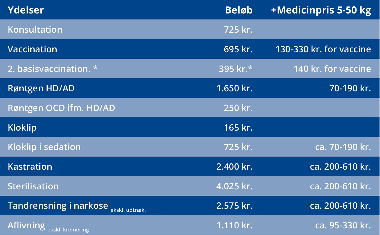 *Forudsat 1. basis er foretaget hos os med samme ejer. Ved andre ydelser fastsættes prisen efter indledende konsultation. Ved alle operationer er evt. suturfjernelse inkl. i prisen og én efterfølgende kontrol er gratis.